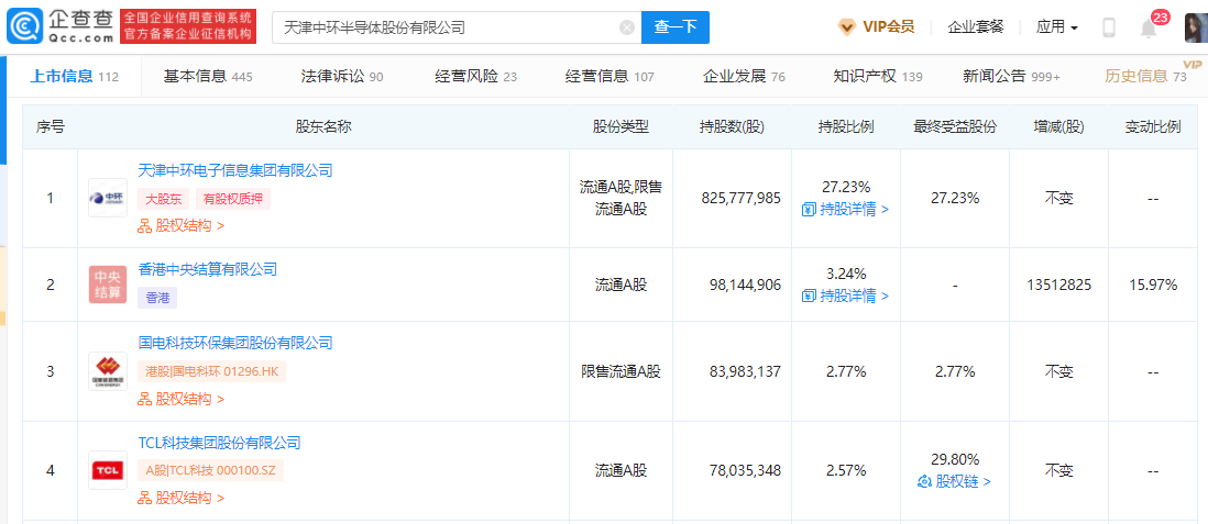 据企查查信息,截至二季度末,TCL科技科技通过天津中环电子信息集团有限公司间接持有中环股份27.23%的股份,并直接持有其2.57%的股份。