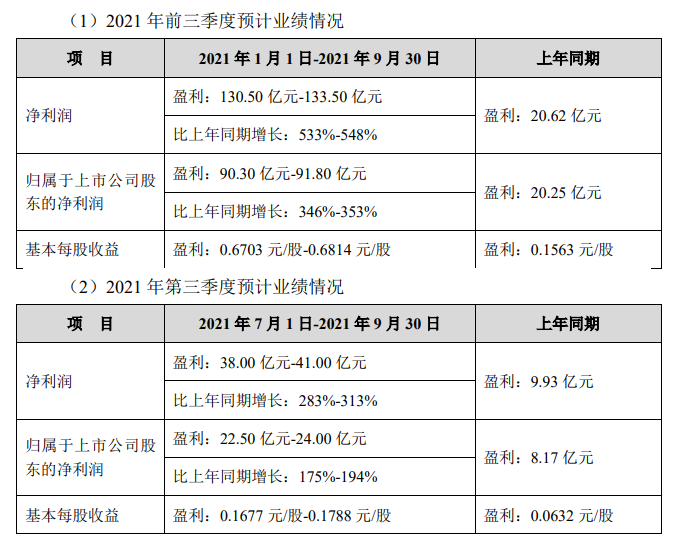 14日晚,中环股份发布业绩预告表示,公司今年前三季度预计实现归属于上市公司股东的净利润 27亿元~ 28亿元,同比增长 219.03%~230.84%;第三季度预计实现归属于上市公司股东的净利润12.20亿元~13.20亿元,同比增长296.11%~328.58%。